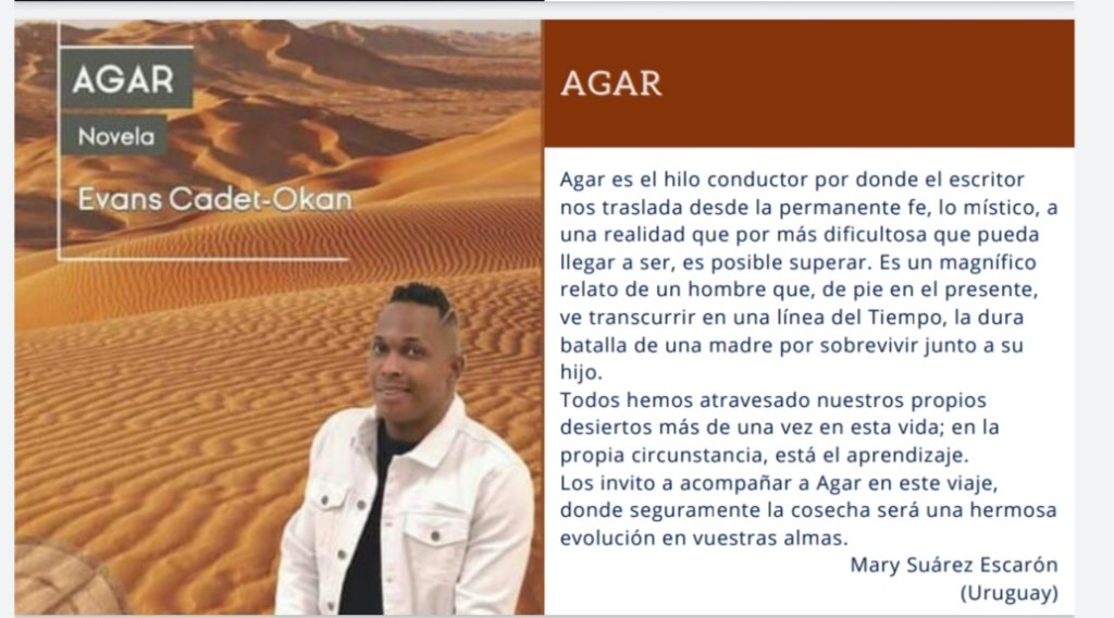 AGAR Agar è il filo attraverso il quale lo scrittore si muove dalla fede permanente, la mistica, a una realtà che non importa quanto difficile possa essere diventare, è possibile superare. È una magnifica storia di un uomo che, in piedi nel presente, vede passare in una linea di tempo, la dura battaglia di una madre per sopravvivere con il figlio. Tutti abbiamo passato il nostro deserto più di una volta in questa vita; nella propria circostanza, c’è l’apprendimento. Ti invito ad accompagnare Agar in questo viaggio, dove sicuramente la vendemmia sarà una bella evoluzione nelle vostre anime. Mary Suarez Escaron (Uruguay)