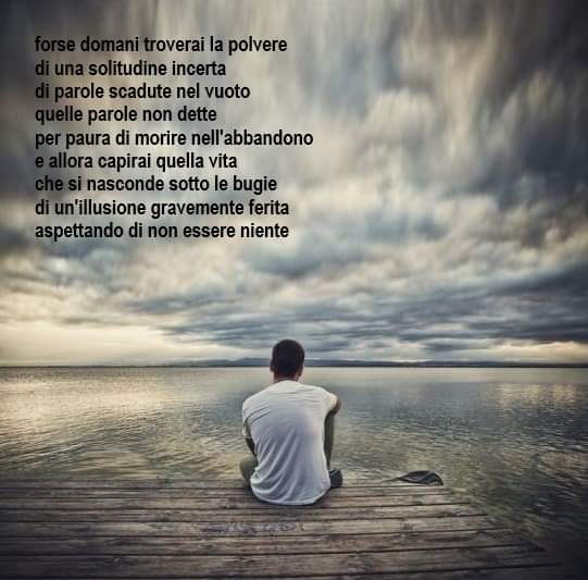 Ίσως αύριο βρεις τη σκόνη μιας αβέβαιης μοναξιάς από λέξεις σκόρπιες στο κενό• εκείνα τα ανείπωτα λόγια από φόβο μήπως πεθάνεις στην εγκατάλειψη – και τότε θα καταλάβεις τη ζωή που κρύβεται κάτω από τα ψέματα μιας βαριά πληγωμένης ψευδαίσθησης προσμένοντας την ανυπαρξία . . forse domani troverai la polvere di una solitudine incerta di parole scadute nel vuoto quelle parole non dette per paura di morire nell’abbandono e allora capirai quella vita che si nasconde sotto le bugie di un’illusione gravemente ferita aspettando di non essere niente
