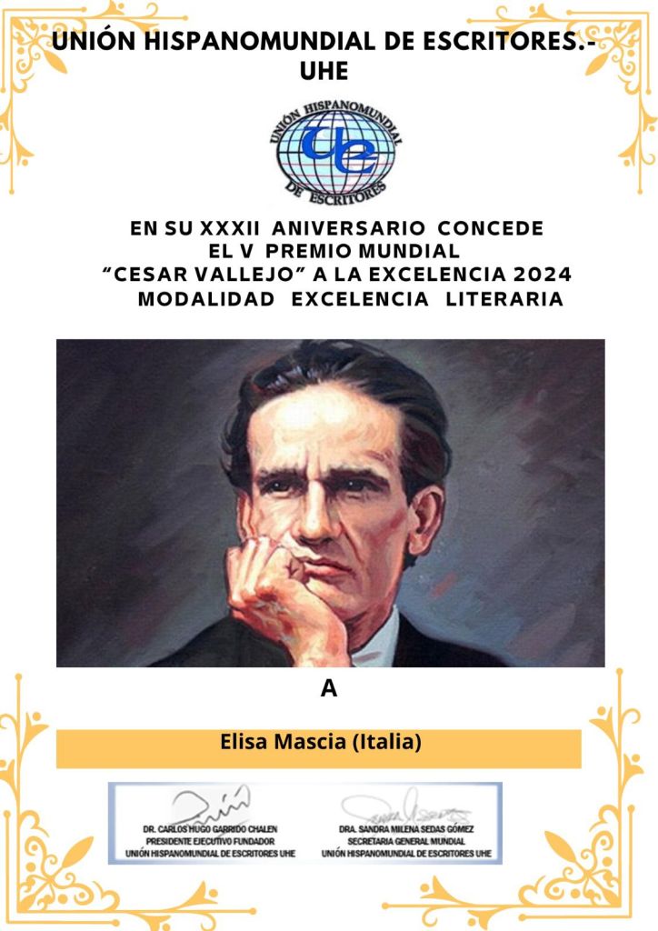 Iniziare il giorno con la condivisione di un prestigioso riconoscimento ricevuto poiché il mio nominativo è stato proposto dall’amico sincero, poeta, giornalista e promotore artistico – culturale nel mondo, Carlos Jarquín , che ringrazio di cuore, è un’emozione immensa e indescrivibile ed oltre ad essere onorata per essere inserita nell’ elenco dei beneficiari del XXXII ANNIVERSARIO DE CREACION DE LA UNION HISPANOMUNDIAL DE ESCRITORES UHE nel settore della ” Letteratura “ Ho il dovere e piacere di ringraziare al Presidente Carlos Hugo Garrido Chalén , alla Segretaria Generale Sandra Milena Sedas Gomez per tutto il loro impegno profuso per omaggiare tutti i settori dell’arte e della cultura nel mondo promuovendone e riconoscendone i meritevoli di provenienza dal Pianeta intero.