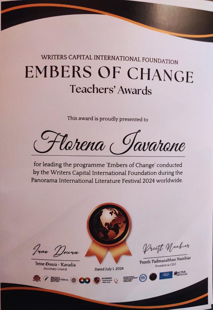 Tra i presenti, dall’Italia la maestra, attrice di teatro, promotrice culturale Florena Iavarone dalla città di Pescara che oltre a realizzare il sogno di visitare la città di Atene, culla della cultura, la polis di Atene fu uno dei maggiori centri dell’antica Grecia e dell’area mediterranea, lasciando una traccia profonda nella storia culturale e politica dell’Europa e del mondo occidentale, è stata insignita di medaglia e attestati per le partecipazioni al Panorama Internazionale Festival della poesia e letteratura 2024 e del prestigioso Premio riconoscimento dedicato al concorso per le scuole, la nuova generazione, sul tema “Embers of Change”.