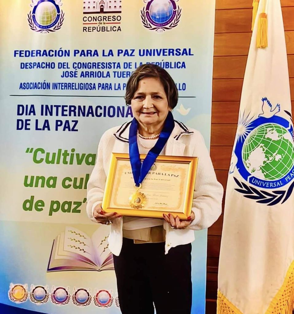 Ha ricevuto, dal Movimento "Pacis Nuntii" - Argentina, l'Attestato e la Bandiera Universale della Pace che conferisce a chi la porta il carattere e lo spirito di Araldo e Costruttore della Pace Universale.