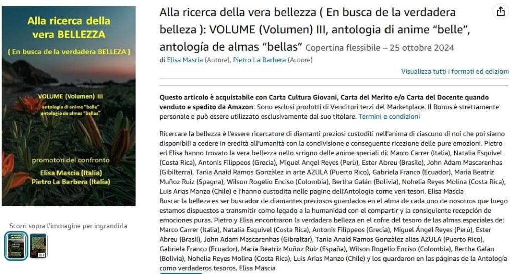 Ricercare la bellezza è l’essere ricercatore di diamanti preziosi custoditi nell’anima di ciascuno di noi che poi siamo disponibili a cedere in eredità all’umanità con la condivisione e conseguente ricezione delle pure emozioni. Pietro ed Elisa hanno trovato la vera bellezza nello scrigno delle anime speciali di: Marco Carrer (Italia), Natalia Esquivel (Costa Rica), Antonis Filippeos (Grecia), Miguel Angel Reyes (Perù), Ester Abreu (Brasile), John Adam Mascarenhas (Gibilterra), Tania Anaid Ramos Gonzàlez in arte AZULA (Puerto Rico), Gabriela Franco (Ecuador), Maria Beatriz Muñoz Ruiz (Spagna), Wilson Rogelio Enciso (Colombia), Bertha Galán (Bolivia), Nohelia Reyes Molina (Costa Rica), Luis Arias Manzo (Chile) e l’hanno custodita nelle pagine dell’Antologia come veri tesori. Elisa Mascia