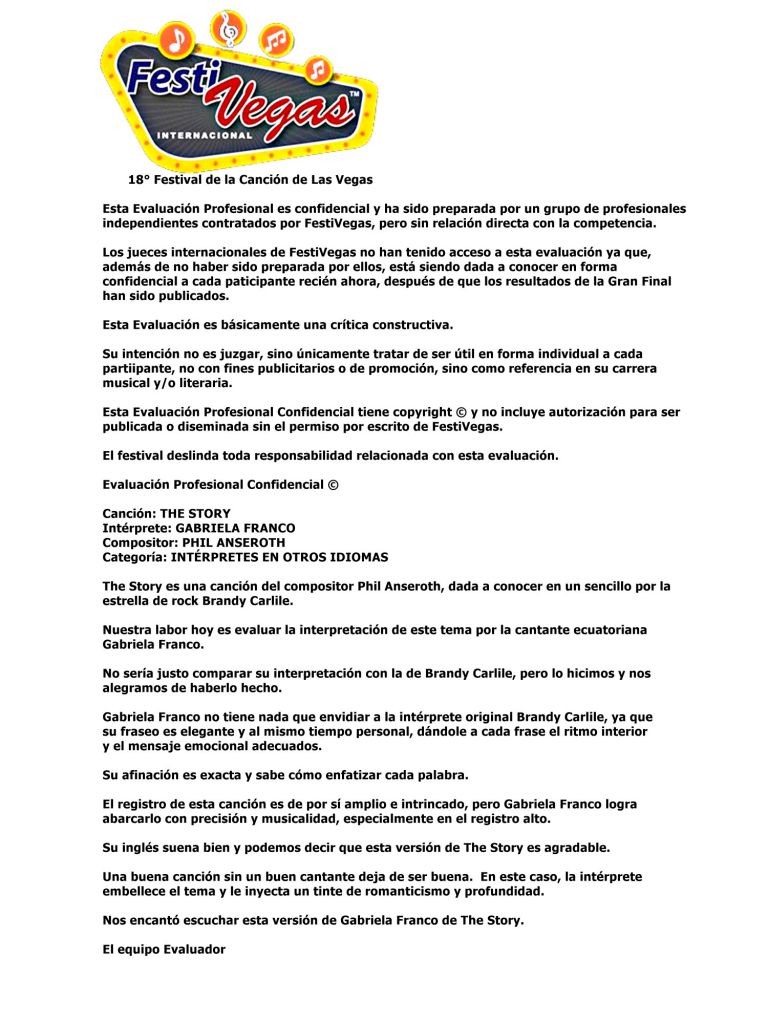Se alza también con el trofeo de platino, 1er lugar del concurso en la categoría “Intérpretes en Otros Idiomas”, con su versión del tema The Story lanzada en 2007 por Brandy Carlile. Sobre esta canción se le ha hecho llegar autorización para divulgar una primera evaluación realizada por un equipo especial del Festivegas, en la etapa de pre selección con palabras maravillosas acerca de su interpretación.