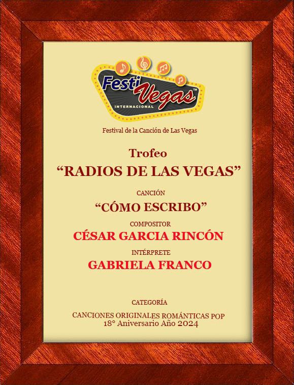 Il premio è stato vinto da Gabriela nella categoria Canzoni pop romantiche originali, con la magistrale musicalizzazione di César e la sua interpretazione del testo della poesia Come scrivo di Mercedes González de Mosco, morta agli inizi del 1900. Si tratta di un trofeo intitolato “ Radio di Las Vegas”.