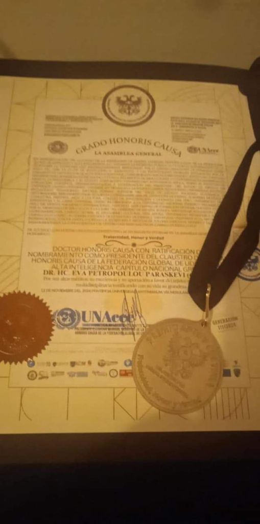 Η χαρά μου και η ευγνωμοσύνη μου απέραντες, σε μια μεγάλη, πνευματική προσωπικότητα, Dra Jeannete Jeanette Eureka Tiburcio , ιδρύτρια και Πρόεδρος τής Ακαδημίας Υψηλής νοημοσύνης και της Λογοτεχνικής εταιρείας Mil Mentes Por Mexico association International που συνεργάζεται με 17 Πανεπιστήμια, σπουδαία διοργανώτρια, μια γυναίκα που ταξίδεψε από το Μεξικό για να γεφυρώσει, να ενώσει, την ποίηση με την ζωγραφική…το μαθηματικό ταλέντο με τη μουσική και να βραβεύσει τους “Γίγαντες του πολιτισμού” και τις ” 50 σημαντικές γυναίκες της Ευρώπης”