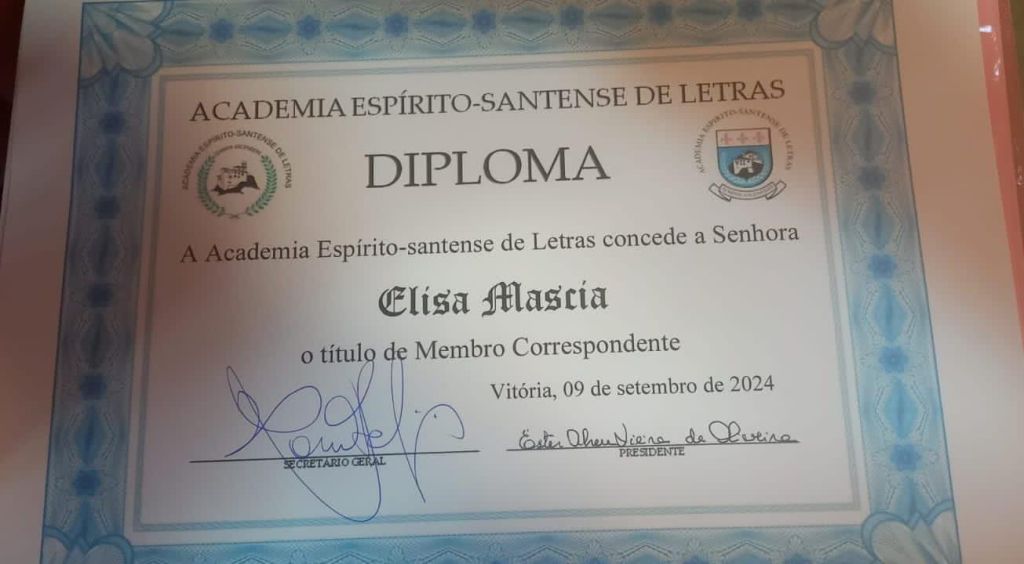 Dall’ Accademia Espirito-Santense De Letras la presidente Ester Abreu Vieira de Oliveira nomina membro Accademico Corrispondente Elisa Mascia dall’Italia