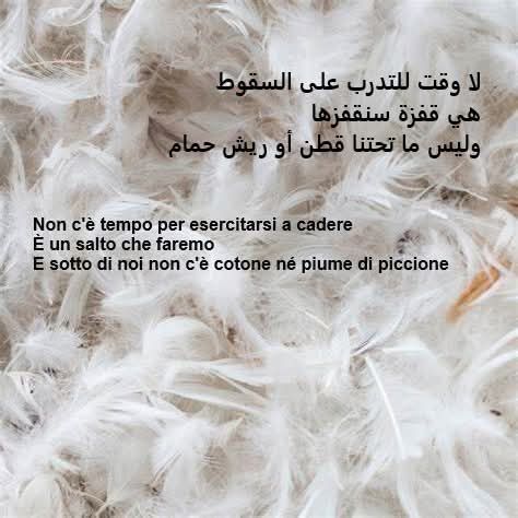 لا وقت للتدرب على السقوط هي قفزة سنقفزها وليس ما تحتنا قطن أو ريش حمام . . Non c’è tempo per esercitarsi a cadere È un salto che faremo E sotto di noi non c’è cotone né piume di piccione . . No hay tiempo para practicar caer Es un salto que daremos Y debajo de nosotros no hay algodón ni plumas de paloma . . No hi ha temps per entrenar per caure És un salt que farem I sota nosaltres no hi ha cotó ni plomes de colom . . ناصر محمود