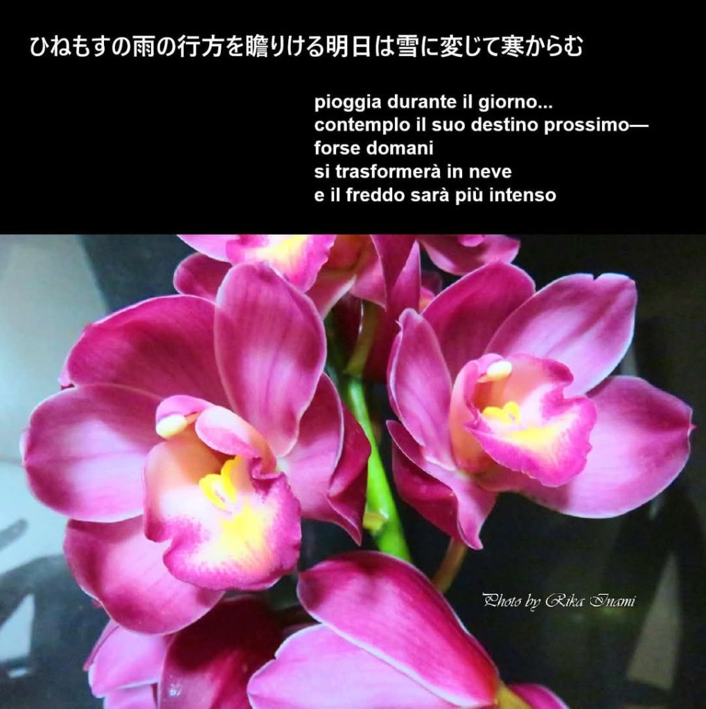 ひねもすの雨の行方を瞻りける明日は雪に変じて寒からむ . . rain through the day… I gaze at its fate ahead— perhaps, tomorrow it will turn into snow and the cold will deepen . . pioggia durante il giorno… contemplo il suo destino prossimo— forse domani si trasformerà in neve e il freddo sarà più intenso . . llueve todo el día… contemplo su próximo destino— tal vez mañana se convierta en nieve y el frío será más intenso . . pluja durant tot el dia… contemplo el seu destí endavant— potser demà es convertirà en neu i el fred serà més intens . . chuva durante o dia… olho para o seu destino à frente – talvez amanhã se transforme em neve e o frio se aprofunde . . Rika Inami 稲美里佳