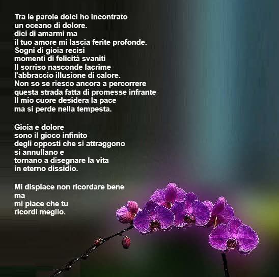 Tra le parole dolci ho incontrato un oceano di dolore. dici di amarmi ma il tuo amore mi lascia ferite profonde. Sogni di gioia recisi momenti di felicità svaniti Il sorriso nasconde lacrime l’abbraccio illusione di calore. Non so se riesco ancora a percorrere questa strada fatta di promesse infrante Il mio cuore desidera la pace ma si perde nella tempesta.