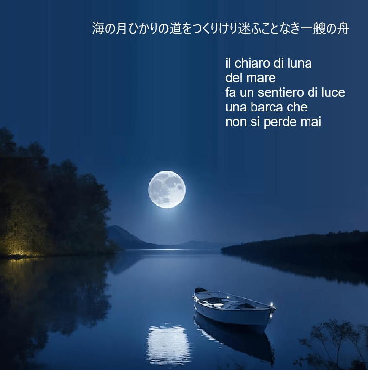 海の月ひかりの道をつくりけり迷ふことなき一艘の舟 . . the moonlight of the sea makes a path of light one boat that never gets lost . . il chiaro di luna del mare fa un sentiero di luce una barca che non si perde mai . . la luz de la luna del mar hace un camino de luz una barca que nunca se pierde . . el clar de lluna del mar fa un camí de llum una barca que mai es perd . . Taro Hokkyo