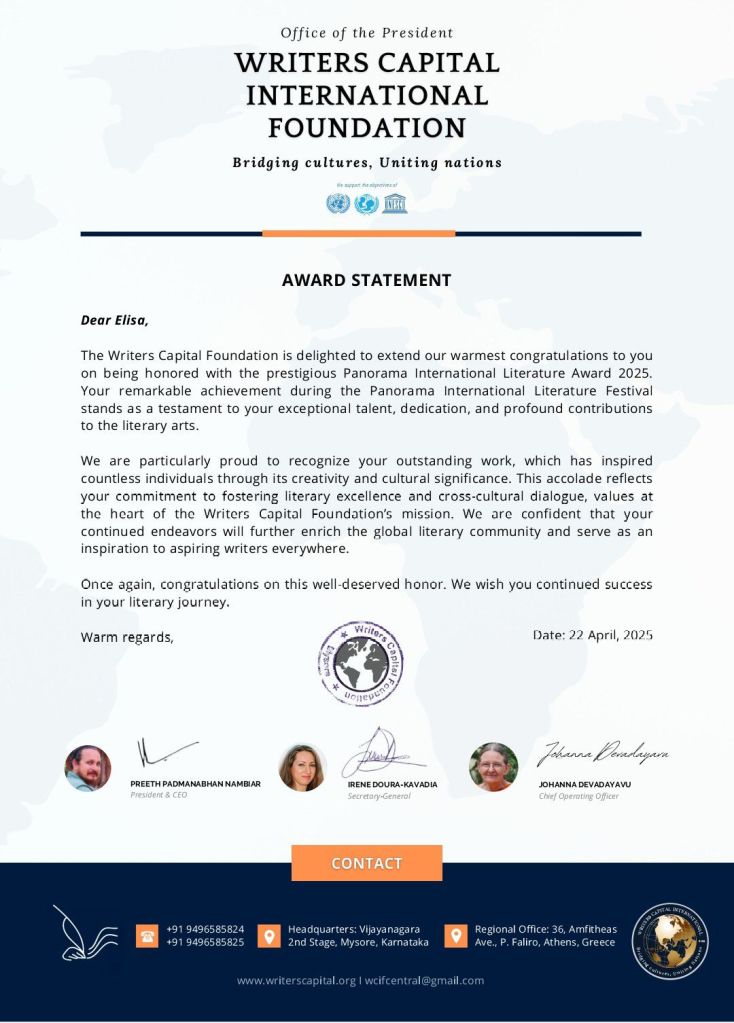 La Writers Capital Foundation è lieta di porgerti le sue più sentite congratulazioni per aver ricevuto il prestigioso Panorama International Literature Award 2025. Il tuo eccezionale risultato al Panorama International Literature Festival esemplifica il tuo straordinario talento, la tua incrollabile dedizione e il tuo significativo contributo alle arti letterarie.