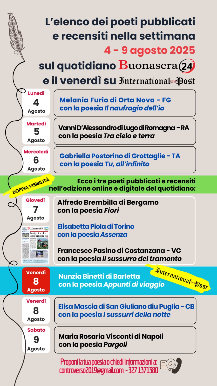Ti confermo che, da lunedì 4 a sabato 9 agosto 2025, la tua poesia sarà pubblicata sulle pagine online del quotidiano pugliese Buonasera24. La rubrica poetica gode di ampia visibilità, grazie all’impegno di ogni autore nel condividere, a partire da lunedì e fino a sabato, il link che fornirò su tutti i propri canali social. Per contribuire alla massima diffusione, ti chiedo di seguire questi semplici passaggi: 1) Instagram e Facebook: pubblica sul tuo profilo il link ricevuto, scegliendo tra post, storia o entrambi. 2) WhatsApp: inoltra lo stesso link a parenti e amici tramite messaggio. Questa condivisione aiuterà a incrementare le visualizzazioni per tutti i poeti coinvolti.