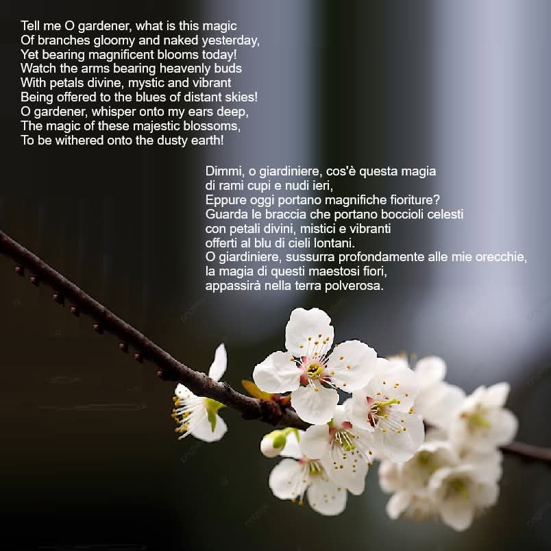 Tell me O gardener, what is this magic Of branches gloomy and naked yesterday, Yet bearing magnificent blooms today! Watch the arms bearing heavenly buds With petals divine, mystic and vibrant Being offered to the blues of distant skies! O gardener, whisper onto my ears deep, The magic of these majestic blossoms, To be withered onto the dusty earth! . . Dimmi, o giardiniere, cos’è questa magia di rami cupi e nudi ieri, Eppure oggi portano magnifiche fioriture? Guarda le braccia che portano boccioli celesti con petali divini, mistici e vibranti offerti al blu di cieli lontani. O giardiniere, sussurra profondamente alle mie orecchie, la magia di questi maestosi fiori, appassirà nella terra polverosa. . . Dime, oh jardinero, ¿qué es esta magia de ramas sombrías y desnudas ayer, pero que hoy dan flores magníficas? Mira los brazos que llevan brotes celestiales con pétalos divinos, místicos y vibrantes ofrecidos al azul de los cielos distantes. Oh jardinero, susurra en mis oídos profundamente, la magia de estas majestuosas flores, se marchitará en la tierra polvorienta. . . Digues-me, oh jardiner, què és aquesta màgia de branques ombrívoles i nues ahir, així i tot, avui tenen unes flors magnífiques? Mira els braços que porten brots celestials amb pètals divins, místics i vibrants oferts al blau dels cels llunyans. Oh jardiner, xiuxiueja a les meves orelles profundament, la màgia d’aquestes majestuoses flors, es marcirà a la terra polsegosa. . . Preeth Padmanabhan Nambiar