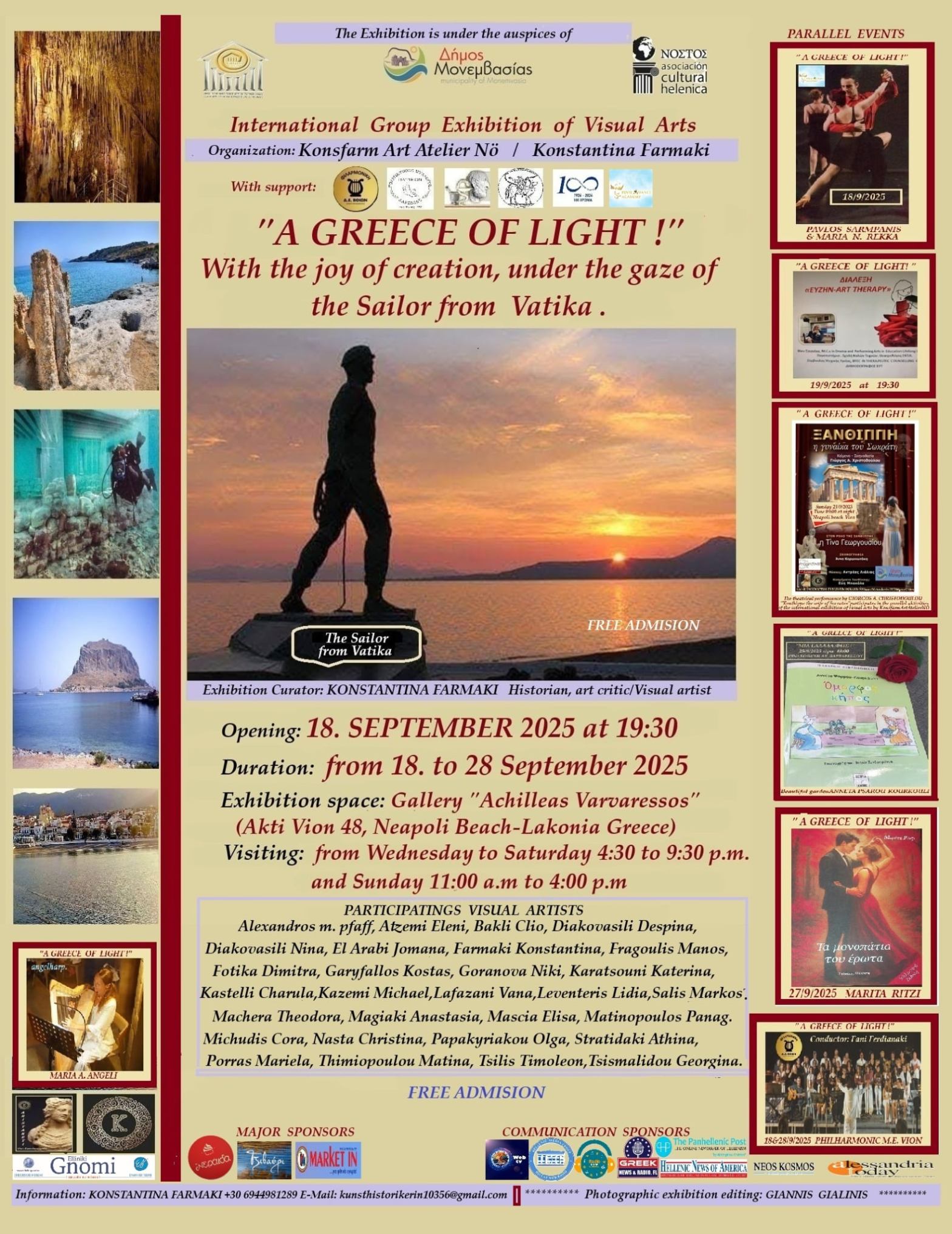 COMUNICATO STAMPAMostra collettiva internazionale di arti visive“UNA GRECIA DI LUCE! Con la gioia della creazione sotto lo sguardo della Marina Militare di Vatikiotis” organizzato da Konstantina Farmaki
