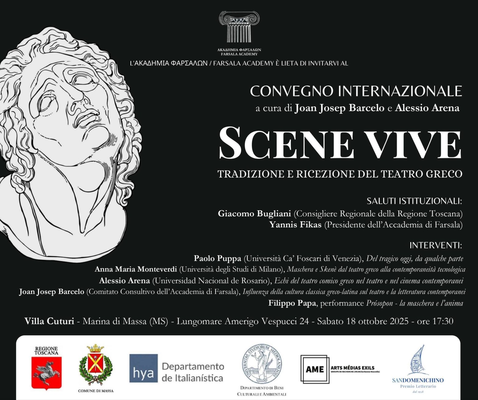 Foto della locandina dell’evento “SCENE VIVE. TRADIZIONE E RICEZIONE DEL TEATRO GRECO” ΑΚΑΔΗΜΙΑ ΦΑΡΣΑΛΩΝ – ΕΛΛΑΔΑ / ACADEMY FARSALA – GREECE / ACCADEMIA FARSALA – GRECIACONVEGNO INTERNAZIONALE a cura di Joan Josep Barcelo e Alessio Arena, “SCENE VIVE. TRADIZIONE E RICEZIONE DEL TEATRO GRECO”.Villa Cuturi – Marina di Massa (MS) – Lungomare Amerigo Vespucci 24Continua a leggere “Incontro: ACCADEMIA FARSALA – GRECIACONVEGNO INTERNAZIONALE a cura di Joan Josep Barcelo e Alessio Arena, “SCENE VIVE. TRADIZIONE E RICEZIONE DEL TEATRO GRECO”.”